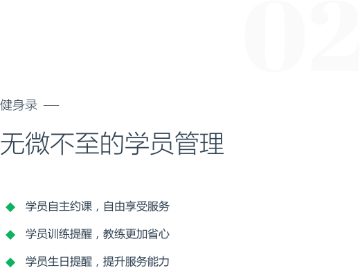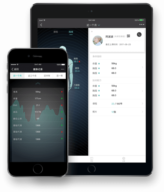 健身录是一个专业的健身教练管理工具。通过健身录可以全方位记录学员训练数据、身体指标、运动测试数据、阶段照片等,从而能够直观的展现课程训练给学员带来的影响,提升学员满意度。同时可以通过健身录轻松的自己的课程安排,提升私教续课率。